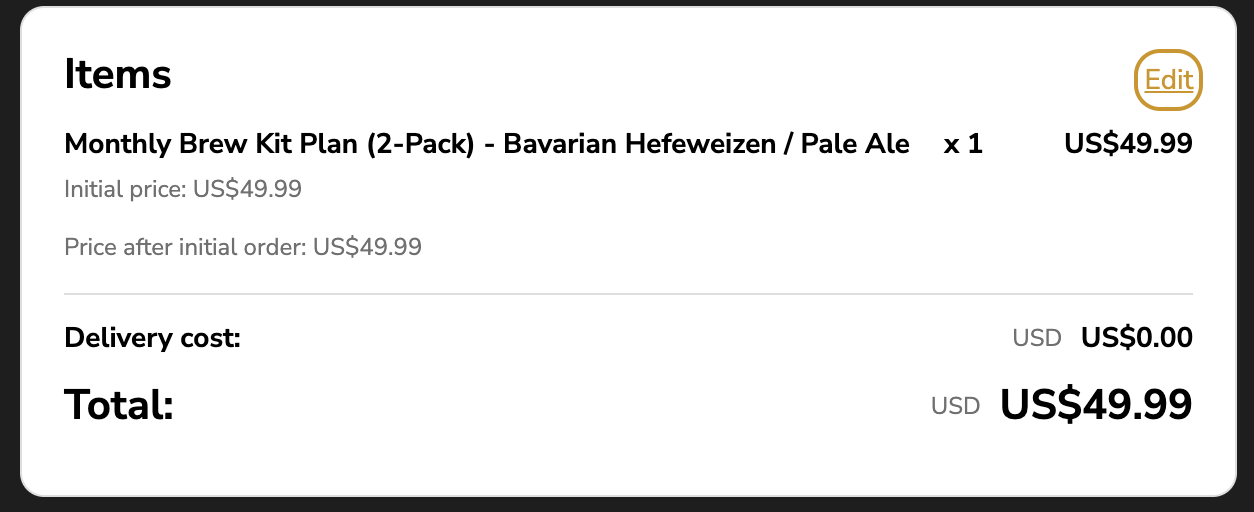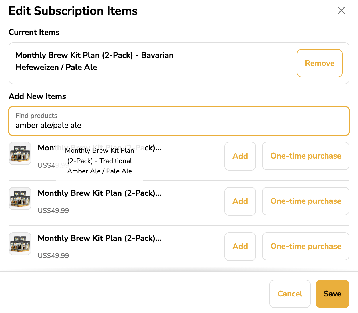 Remove the current brew kits. In the search bar, enter the brew kit combination you want and select the correct option labeled “Monthly brew kit subscription”, then save.